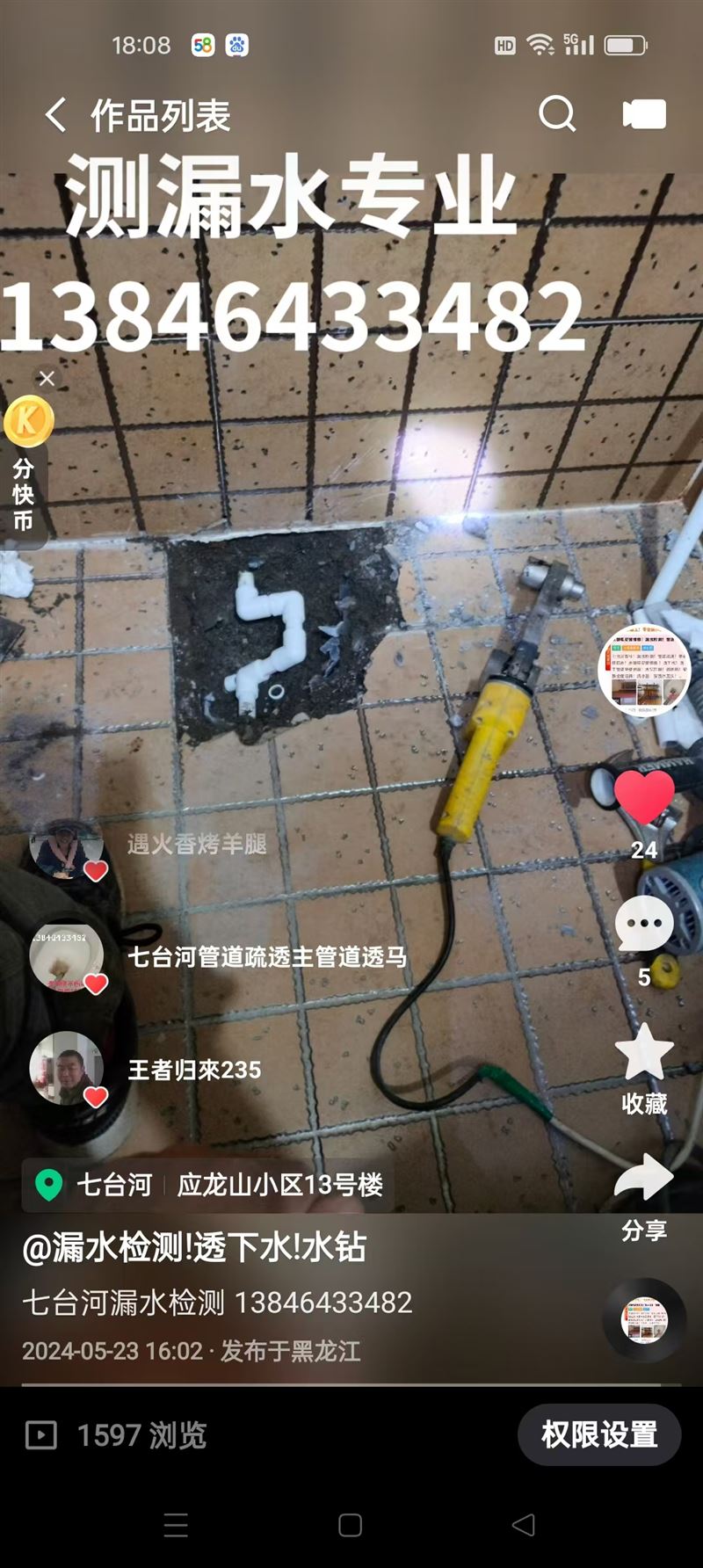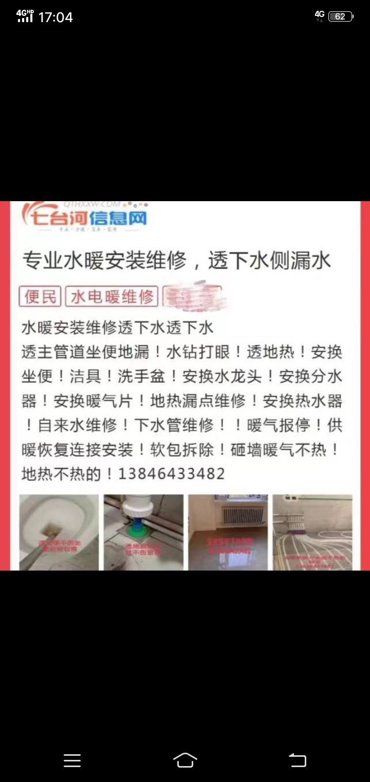 七臺(tái)河專業(yè)!漏水檢測!管道疏通!挖下水改獨(dú)立管道!免砸磚防水!水暖電安裝維修 !透下水!透主管道坐便地漏!水鉆打眼!透地?zé)?!安換坐便潔具!洗手盆!安換水龍頭!安換分水器!安換暖氣片!安換熱水器!自來水維修!下水管維修!暖氣報(bào)停!供暖恢復(fù)連接安裝!軟包拆除!砸墻!暖氣不熱!地?zé)岵粺岬穆?lián)系!13846433482