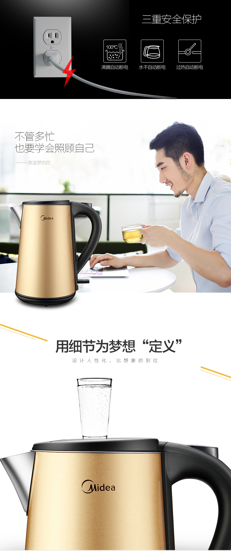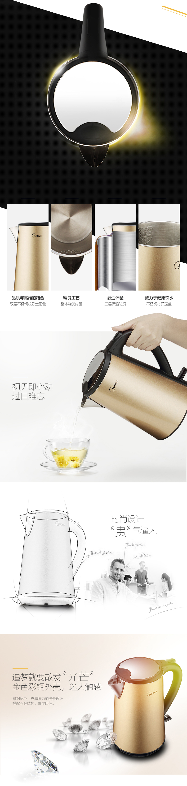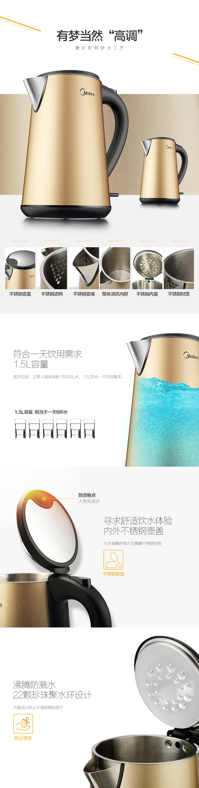 三層彩鋼防燙;6D全鋼(壺身、壺頂蓋、壺嘴、壺內(nèi)膽、過(guò)濾網(wǎng)、壺內(nèi)蓋);strix進(jìn)口溫控器,高效控溫;無(wú)縫內(nèi)膽,更易清潔;流行土豪金配色