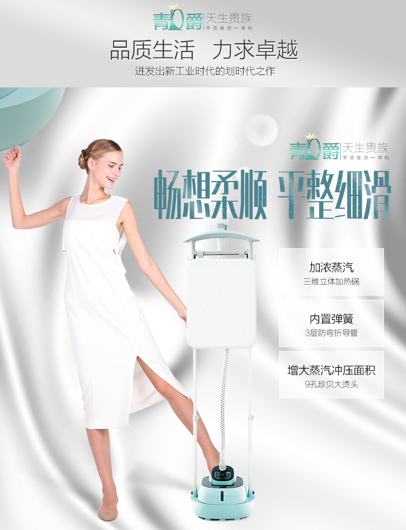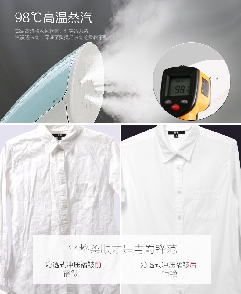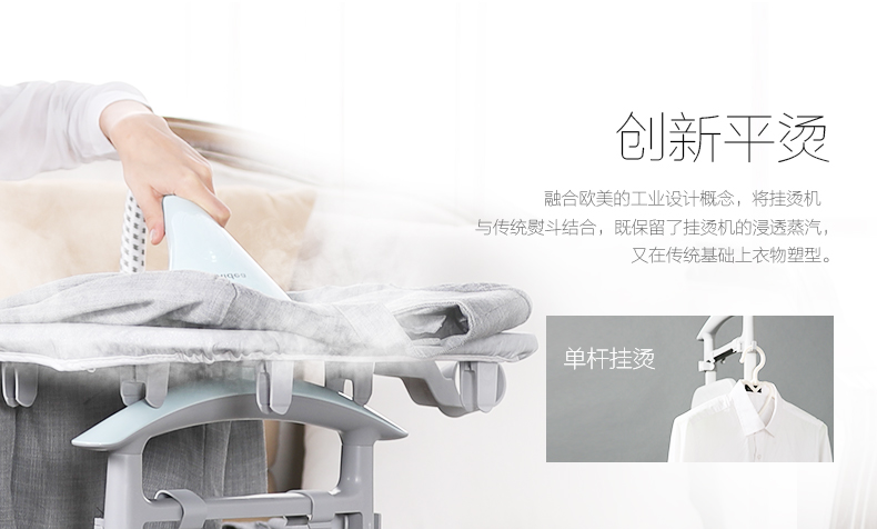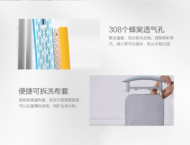 可臥可立系統(tǒng);九孔面板燙頭;靜音聚能熱鍋;三重防折導汽管;六檔熨燙功能