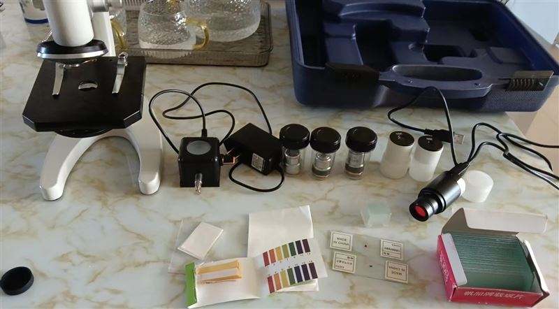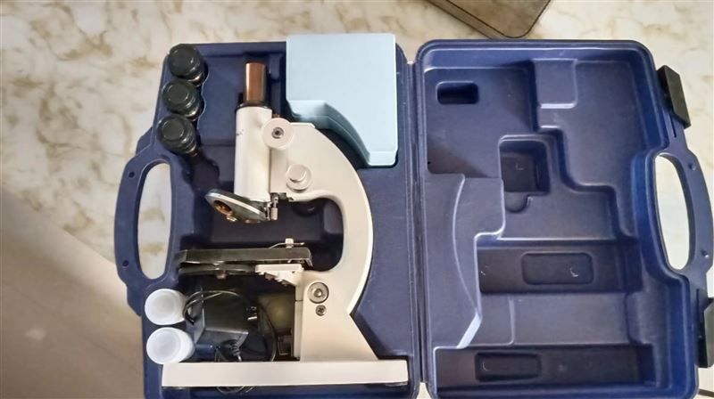 貝朗顯微鏡,640倍,帶電子顯微目鏡,電子反光鏡,配有載玻片蓋玻片吸水紙顯色卡,擦鏡紙,裝備箱,原價(jià)240,八九成新,鏡片無磨損
