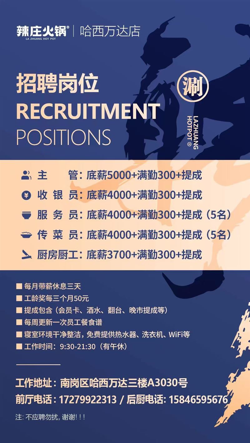 招聘: 火鍋店招聘服務員,底薪+滿勤+帶..